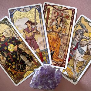 Court cards are killer, there’s no way around it. Every tarot reader hates court cards because they’re nearly impossible to read. If you pull one or two, you can find a way to make them make sense, but when you pull five in a single reading (as I have done many, many times) you can’t help but wonder what the hell to do with them.